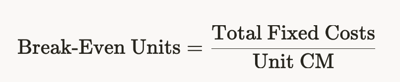 Once you know your Total CM, you can calculate how many units, or how much revenue you need to cover your fixed costs: