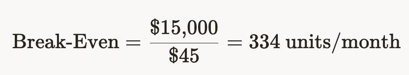 Example: If your monthly fixed costs are $15,000 and your unit CM is $45: